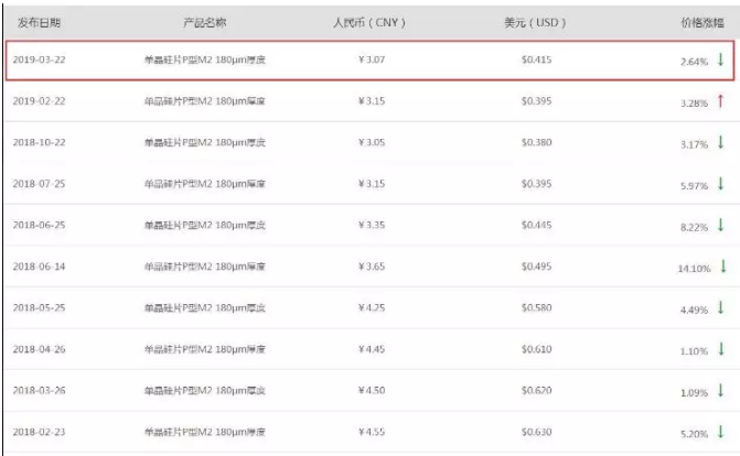 值得一提的是,在幾天前單晶巨頭隆基股份也將單晶硅片價(jià)格進(jìn)行了下調(diào),單晶硅片P型M2(厚度180μm)價(jià)格由3.15元/片下調(diào)至3.07元/片,海外報(bào)價(jià)0.415美元/片,比2月22日價(jià)格下調(diào)了2.64%。
