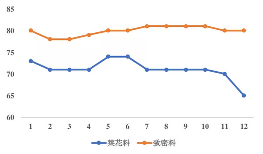 根統(tǒng)計,3月份以來,菜花料的價格一直持續(xù)下降,跟致密料的價差也有所增加。就在上周,菜花料的價格還在63~70元/kg,均價為65元/kg。