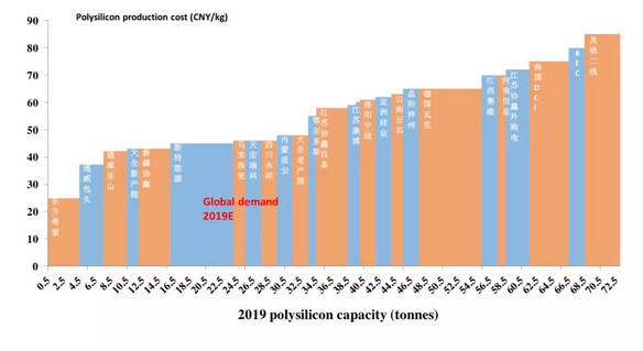 圖:2019年各硅料企業(yè)的成本及產能分布(元/kg)
