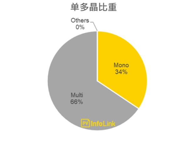 目前市場(chǎng)以多晶組件為主流需求,占66%的市場(chǎng)份額,單晶比重則約34%,其他類型的組件市占僅不到0.5%。