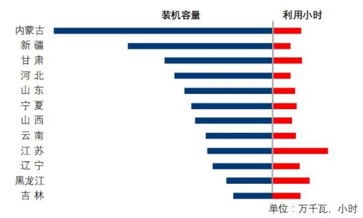 圖5 1-2月份風(fēng)電裝機較多省份風(fēng)電裝機容量和設(shè)備利用小時