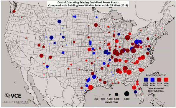 根據(jù)美國(guó)VCE(Vibrant Clean Energy)公司的數(shù)據(jù),2018年美國(guó)絕大多數(shù)燃煤電廠的運(yùn)行成本介于33美元 ——111美元/兆瓦時(shí)(不考慮投資成本);2018年太陽(yáng)能光伏的平準(zhǔn)化成本(考慮投資、運(yùn)維全生命周期內(nèi)成本)在28美元——52美元/兆瓦時(shí)之間,而風(fēng)電平準(zhǔn)化成本區(qū)間更大(因地點(diǎn)資源質(zhì)量不同),介于13美元至88美元/兆瓦時(shí)之間。