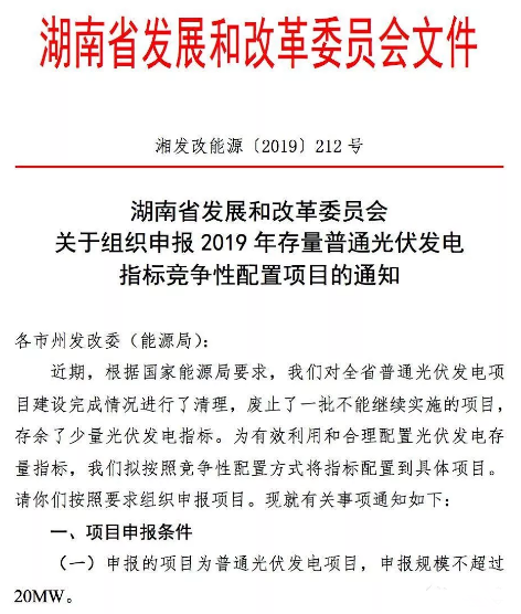 日前,湖南省發(fā)改委下發(fā)了《關(guān)于組織申報2019年存量普通光伏發(fā)電指標競爭性配置項目的通知》,通知稱,近期,根據(jù)能源局的要求,對全省普通光伏發(fā)電項目建設(shè)完成情況進行了清理,廢止了一批不能繼續(xù)實施的項目,存余了少了光伏發(fā)電指標。為了有效利用和合理配置光伏發(fā)電存量指標,擬按照競爭性配置方式將質(zhì)保配置到具體項目。