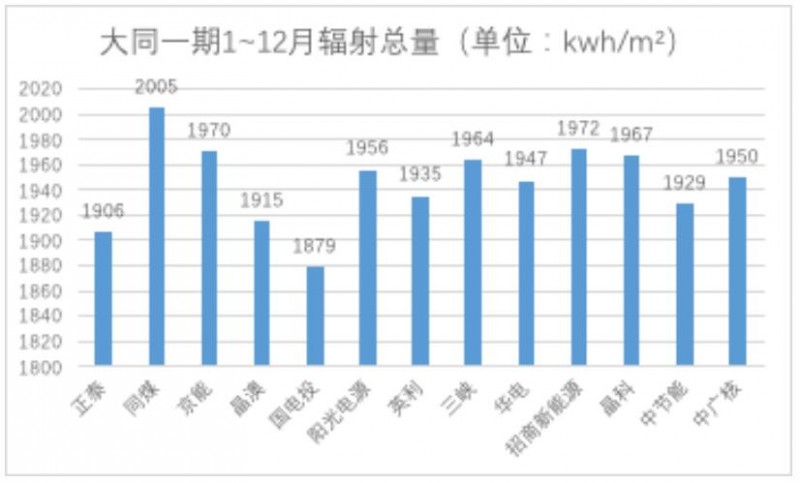 通過上圖可以看出,國(guó)電投、正泰、晶澳的全年輻射總量最低,招商新能源與同煤的全年輻射總量最高;在相應(yīng)的發(fā)電量表現(xiàn)上,招商與同煤兩家的發(fā)電量自然遙遙領(lǐng)先,而國(guó)電投與晶澳則相對(duì)較低。