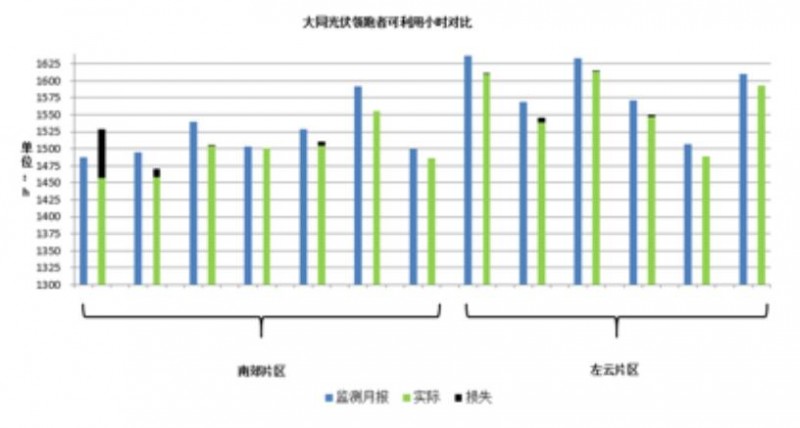 從上圖可以看出,南郊片區(qū)粉塵較大,左云片區(qū)粉塵較少,由此也導(dǎo)致了南郊片區(qū)光伏方陣受陰影遮擋影響更大,電站發(fā)電量相對(duì)偏低。結(jié)合上圖重新整理后的發(fā)電圖表(按片區(qū)重新劃分),位于南郊片區(qū)的7個(gè)項(xiàng)目,相比左云片區(qū)的其余6個(gè)項(xiàng)目,受遮擋影響的發(fā)電損失表現(xiàn)更為嚴(yán)重。