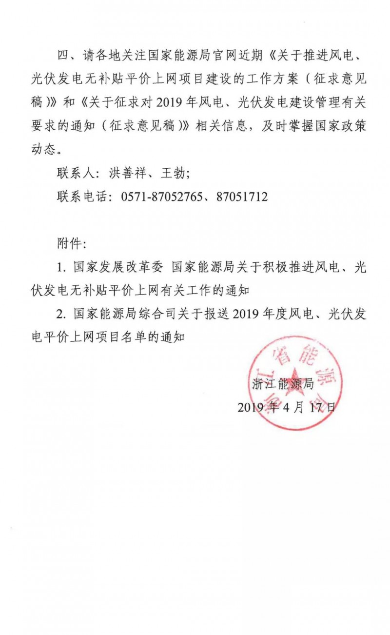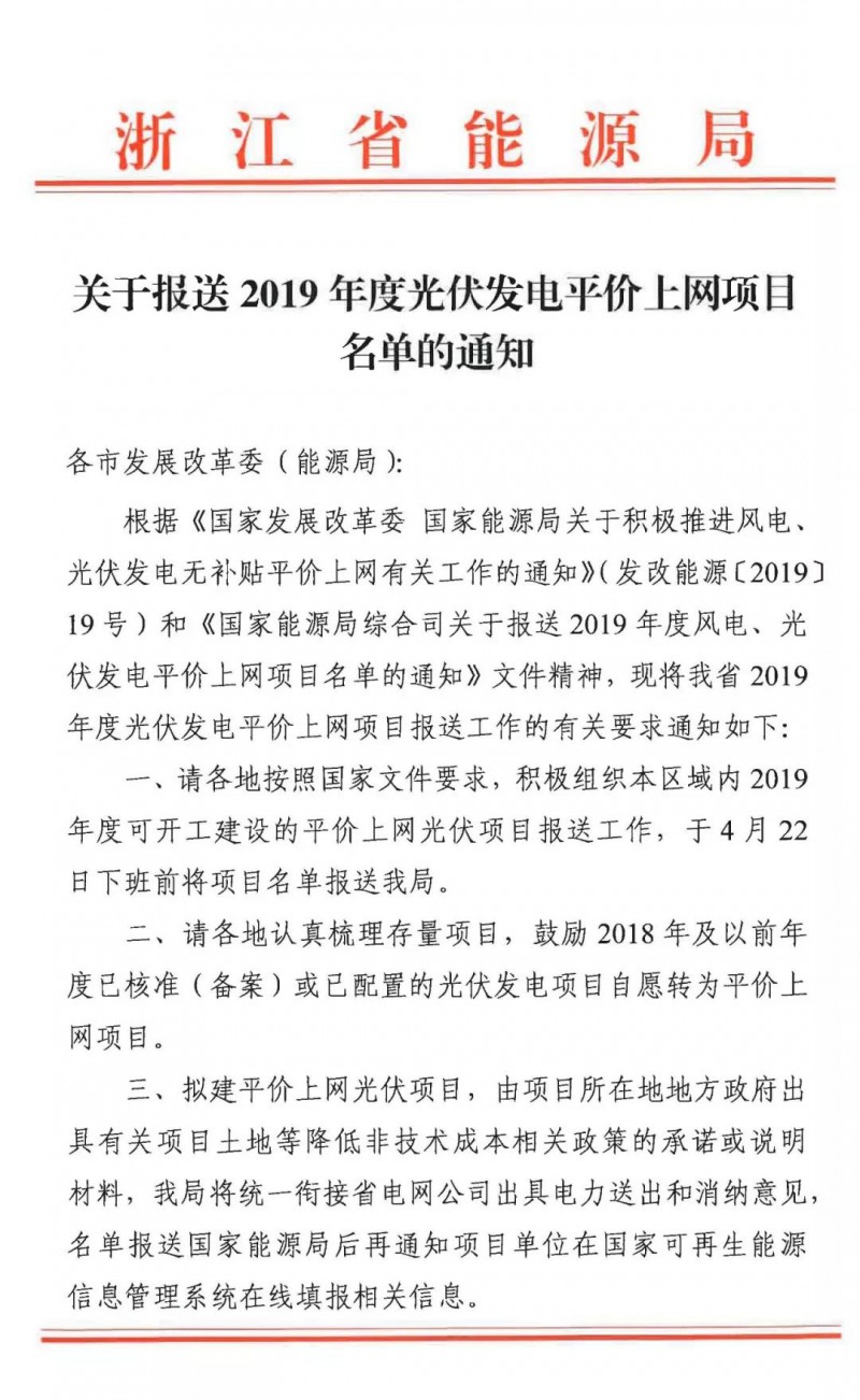 浙江省能源局關(guān)于報(bào)送2019年度光伏發(fā)電平價(jià)上網(wǎng)項(xiàng)目名單的通知
