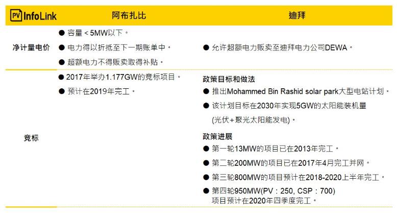 阿拉伯聯(lián)合酋長(zhǎng)國(guó)是由七個(gè)酋長(zhǎng)國(guó)組成,其中迪拜(Dubai)以及阿布扎比(Abu Dhabi)最具影響力,在光伏發(fā)展上,兩大酋長(zhǎng)國(guó)也有各自不同的政策激勵(lì)計(jì)劃,同時(shí)也主導(dǎo)了阿聯(lián)酋的光伏發(fā)展走向,整理如下表。