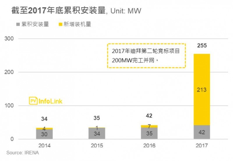 截至2017年底阿聯(lián)酋光伏裝機(jī)量達(dá)255MW,其中2017年的新增裝機(jī)量一口氣增加213MW,對(duì)比過(guò)去的新增項(xiàng)目數(shù)量有明顯提升,推測(cè)原因可能在于第二輪200MW的競(jìng)標(biāo)項(xiàng)目完工并網(wǎng)所致。