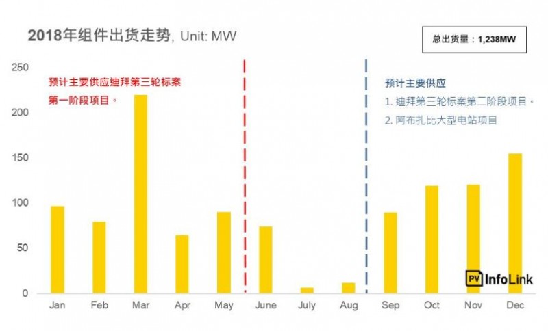 根據(jù)PV Infolink海關(guān)數(shù)據(jù)庫(kù)統(tǒng)計(jì),2018全年中國(guó)組件出貨至阿聯(lián)酋的總量約落在1,238MW。