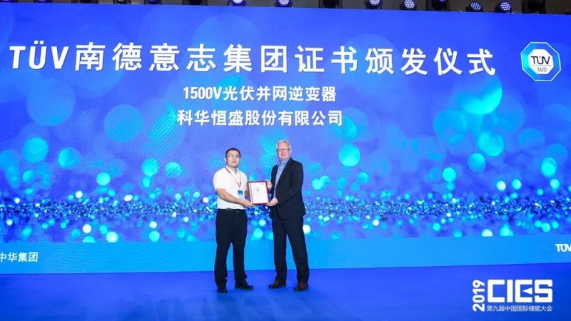 會(huì)議期間,科華恒盛產(chǎn)品1500V光伏并網(wǎng)逆變器獲得世界上規(guī)模最大TÜV檢驗(yàn)機(jī)構(gòu)之一——TÜV南德意志集團(tuán)認(rèn)證并頒發(fā)證書。該證書的獲得,表明科華1500V逆變器符合安規(guī)的認(rèn)證要求。