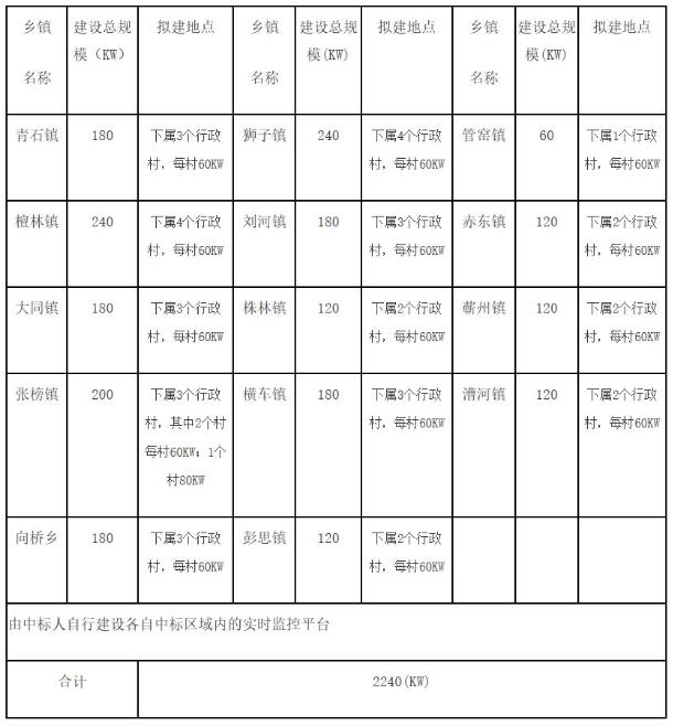 2019年度分別在全縣14個(gè)鄉(xiāng)鎮(zhèn)擬建設(shè)36個(gè)60KW、1個(gè)80KW村級(jí)光伏電站,要求利用地面或電網(wǎng)接入條件較好的荒山荒坡及灘涂地帶,建設(shè)總裝機(jī)規(guī)模為2.24MWP(具體詳見(jiàn)附表)。投標(biāo)人須在中標(biāo)后,建設(shè)其所中標(biāo)區(qū)域內(nèi)符合《村級(jí)光伏扶貧電站數(shù)據(jù)采集終端技術(shù)規(guī)范》(國(guó)開(kāi)辦司函〔2019〕49號(hào))文件的要求的實(shí)時(shí)監(jiān)控平臺(tái)。