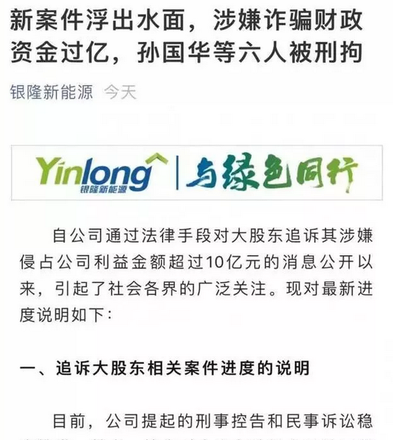 4月25日中午,銀隆新能源微信公眾號確認了公司大股東魏銀倉身在美國,孫國華等6人已被刑事拘留的信息。