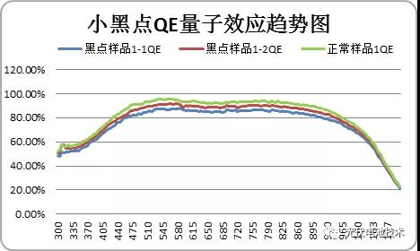 圖1整個波段沒有明顯差異,只是中波段正常區(qū)域比黑斑區(qū)域量子效率略高,工藝過程不是問題,問題主要是整個生產過程雜質顆粒對電池半成品的污染所致。