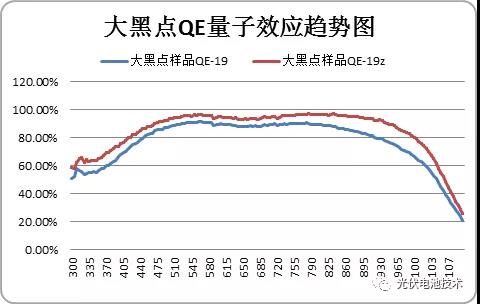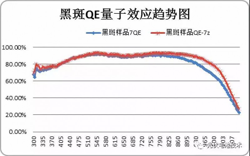 如圖1-3,正常單晶電池片和黑斑電池片的量子效應隨波長的變化趨勢大致相同,說明與硅片的質量關系較小。