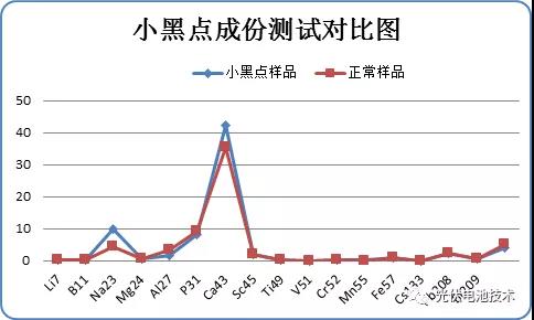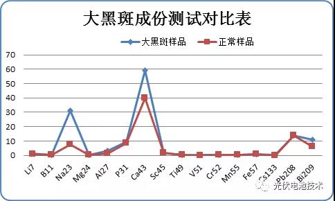從數(shù)據(jù)來推斷圖5、圖6在黑斑區(qū)域雜質元素含量明顯高,形成了較強的復合中心,而我們的測試樣品是經過混合酸去除了電極和背場,在電池生產含Na和Ca元素的是酸液,而只有刻蝕和制絨兩個工序涉及,刻蝕工序酸洗的是電池片背面,我們測試是正面燒蝕厚度約15μm,因此制絨酸液殘留的可能性較大,圖4在小黑點區(qū)域略高,粉塵顆粒在過程中污染表面的可能性較大。