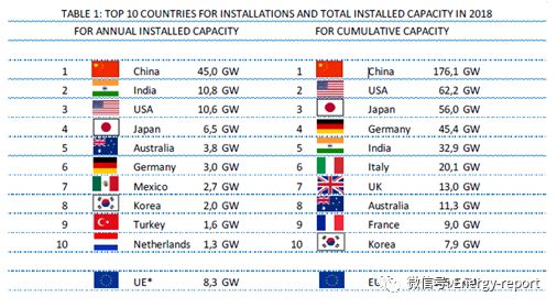 除了一些國家的排名發(fā)生了變化外,前五名與2017年非常相似。此外,2018年的主要發(fā)展是其他幾個(gè)排在前五名之后的國家的增長:澳大利亞裝機(jī)容量為3.8 GW,墨西哥為2.7 GW,韓國為2.0 GW。土耳其緊隨其后,在不斷下滑的市場中獲得了1.6 GW的裝機(jī)容量。再深入研究一下歐盟國家,德國經(jīng)歷了自2013年以來最好的一年,裝機(jī)容量約為3.0 GW,荷蘭進(jìn)入前10名,裝機(jī)容量為1.3 GW。