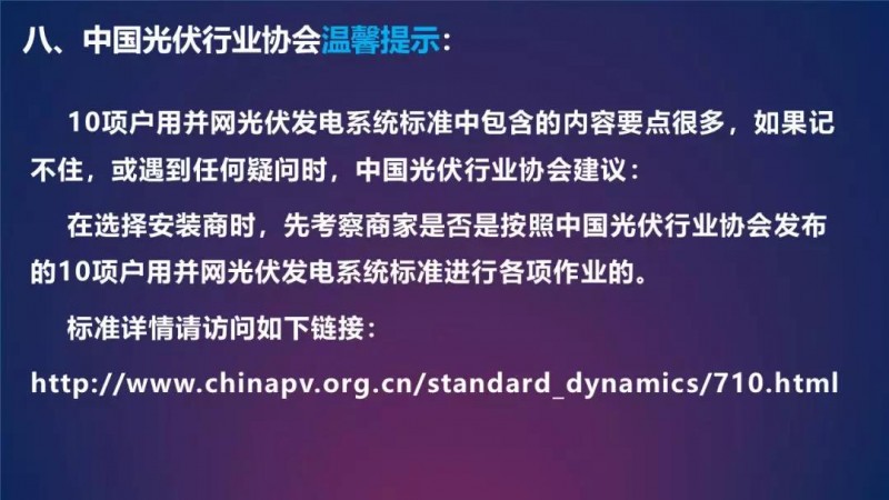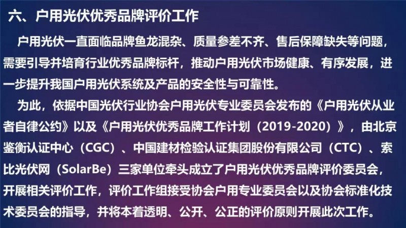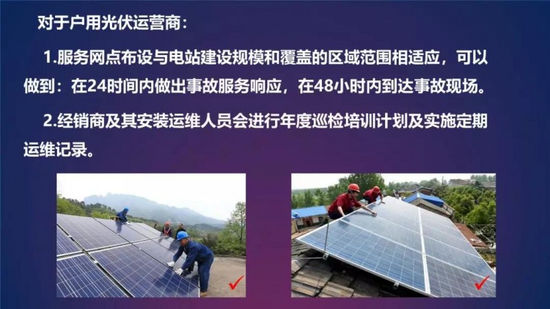 2019年4月30日國家發(fā)展改革委下發(fā)了《關(guān)于完善光伏發(fā)電上網(wǎng)電價機(jī)制有關(guān)問題的通知》,通知中明確了戶用分布式光伏的單獨(dú)電價政策,按照全發(fā)電量0.18元/度補(bǔ)貼。這意味著在全國大部分地區(qū),戶用光伏的收益率是有一定吸引力的。戶用光伏可以說是關(guān)系到千家萬戶的民生工程,不能有半點(diǎn)馬虎,因此質(zhì)量問題尤為關(guān)鍵。今年3月協(xié)會發(fā)布實(shí)施了10項(xiàng)中國光伏行業(yè)協(xié)會戶用光伏并網(wǎng)發(fā)電系統(tǒng)系列標(biāo)準(zhǔn)。
