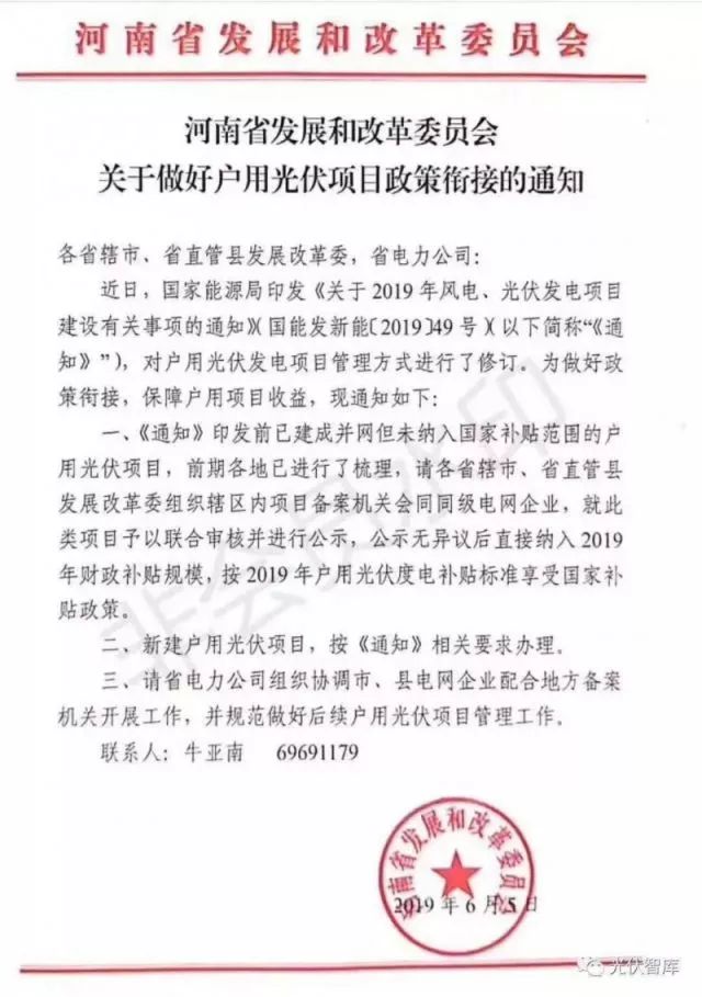 6月5日,河南省發(fā)改委發(fā)布《關(guān)于做好戶用光伏項目政策銜接的通知》,通知提到,2019年5月30日之前已建成并網(wǎng)但未納入國家補貼范圍的戶用