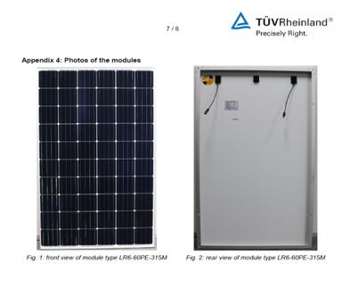 近日,隆基股份成員企業(yè)樂葉光伏收到“LR6-60PE-315M”型單晶組件通過TÜV萊茵的測試報告,報告顯示:基于60片P型PERC單晶156*156mm電池組件,在標準測試條件(STC)下的組件功率達到316.6W,功率刷新行業(yè)新高。據(jù)了解,測試數(shù)據(jù)是TÜV系統(tǒng)目前所測得的該型號最高功率。