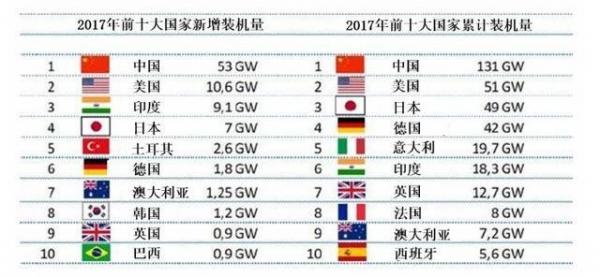 2017年度,我國光伏新增并網(wǎng)裝機量達到53GW,同比增長超過50%,累計并網(wǎng)裝機量高達131GW,位居全球首位。