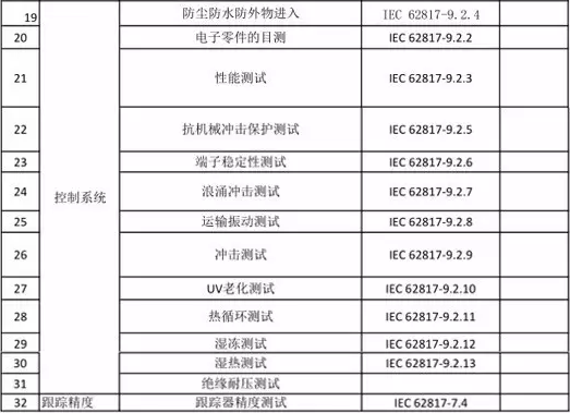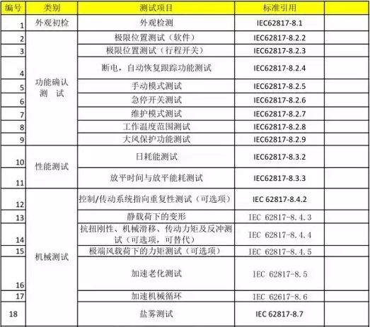 跟蹤支架最為科技性較強(qiáng)的產(chǎn)品,其檢測標(biāo)準(zhǔn)也很復(fù)雜,關(guān)于跟蹤支架的檢測標(biāo)準(zhǔn),筆者采訪了TUV南德中國區(qū)光伏事業(yè)部總經(jīng)理許海亮,他介紹說:對于跟蹤支架,美標(biāo)是參考UL3703,IEC是參考了IEC62817的標(biāo)準(zhǔn)。國內(nèi)還沒有參考的國標(biāo),根據(jù)以往經(jīng)驗(yàn),國標(biāo)往往會參考IEC標(biāo)準(zhǔn)。主要檢測項(xiàng)目與要求如下: