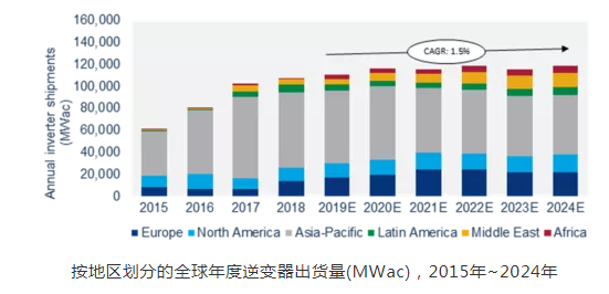 預(yù)計(jì)隨著市場的變化,從2019年到2024年,集中式逆變器和三相逆變器的任何產(chǎn)品類型收入都將下降最多。而微型逆變器,單相組串式逆變器,直流優(yōu)化器和混合存儲(chǔ)的逆變器在出貨量方面雖然是小份額市場,但市場會(huì)有所增長。