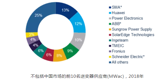 2018年,中國逆變器制造商占全球出貨量的28%,高于2017年出貨量的22%和2016年的14%,在歐洲、拉丁美洲、中東等地區(qū),中國公司的市場份額也比去年有所增長。作為全球頂級逆變器制造商,華為在拉丁美洲、歐洲等地區(qū)的擴(kuò)張非常成功。
