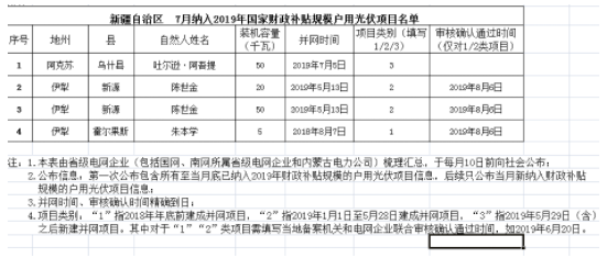 戶用光伏項(xiàng)目信息公布和報(bào)送有關(guān)事項(xiàng)的通知》(國(guó)能綜通新能〔2019〕45號(hào))工作要求,國(guó)網(wǎng)新疆電力有限公司對(duì)2019年7月戶用光伏發(fā)電項(xiàng)目進(jìn)行了梳理,現(xiàn)將相關(guān)信息予以公告。