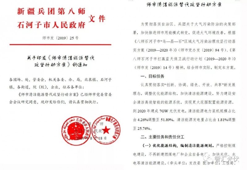 2019年8月,新疆石河子市出臺清潔能源替代攻堅行動方案。提出到2020年底建成7GW光伏發(fā)電,清潔能源電力裝機規(guī)模占比由4.26%調(diào)整至51.89%,清潔能源發(fā)電量占比由1.81%調(diào)整至25.74%;并明確了送出方案。