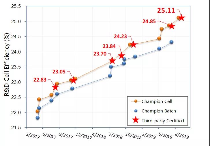 自2017至2019年,漢能SHJ電池轉換效率穩(wěn)步提升,從22.85%至25.11%,均獲第三方認證。