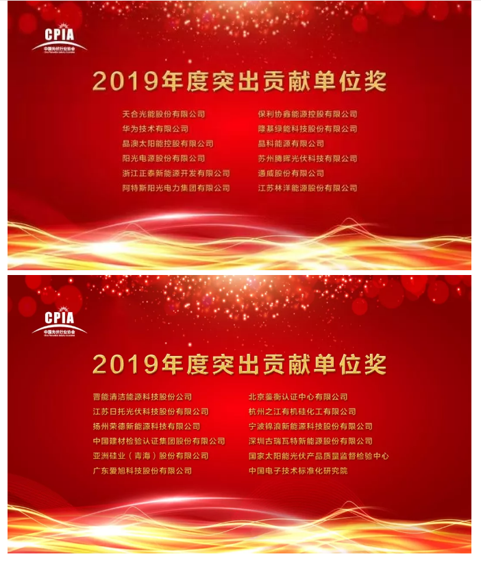 為感謝2019年度,在協(xié)會各項會議活動、標(biāo)準(zhǔn)及戶用工作等方面,為協(xié)會做出了突出貢獻(xiàn)的會員單位,“2019中國光伏行業(yè)年度大會暨創(chuàng)新發(fā)展高峰論壇”期間,中國光伏行業(yè)協(xié)會特授予天合光能股份有限公司、華為技術(shù)有限公司、晶澳太陽能控股有限公司、陽光電源股份有限公司、浙江正泰新能源開發(fā)有限公司、阿特斯陽光電力集團(tuán)有限公司、保利協(xié)鑫能源控股有限公司、隆基綠能科技股份有限公司、晶科能源有限公司、蘇州騰暉光伏科技有限公司、通威股份有限公司、江蘇林洋能源股份有限公司、晉能清潔能源科技股份公司、江蘇日托光伏科技股份有限公司、揚(yáng)州榮德新能源科技有限公司、中國建材檢驗認(rèn)證集團(tuán)股份有限公司、亞洲硅業(yè)(青海)股份有限公司、廣東愛旭科技股份有限公司、北京鑒衡認(rèn)證中心有限公司、杭州之江有機(jī)硅化工有限公司、寧波錦浪新能源科技股份有限公司、深圳古瑞瓦特新能源股份有限公司、國家太陽能光伏產(chǎn)品質(zhì)量監(jiān)督檢驗中心、中國電子技術(shù)標(biāo)準(zhǔn)化研究院等24家單位“2019年度突出貢獻(xiàn)單位獎”。