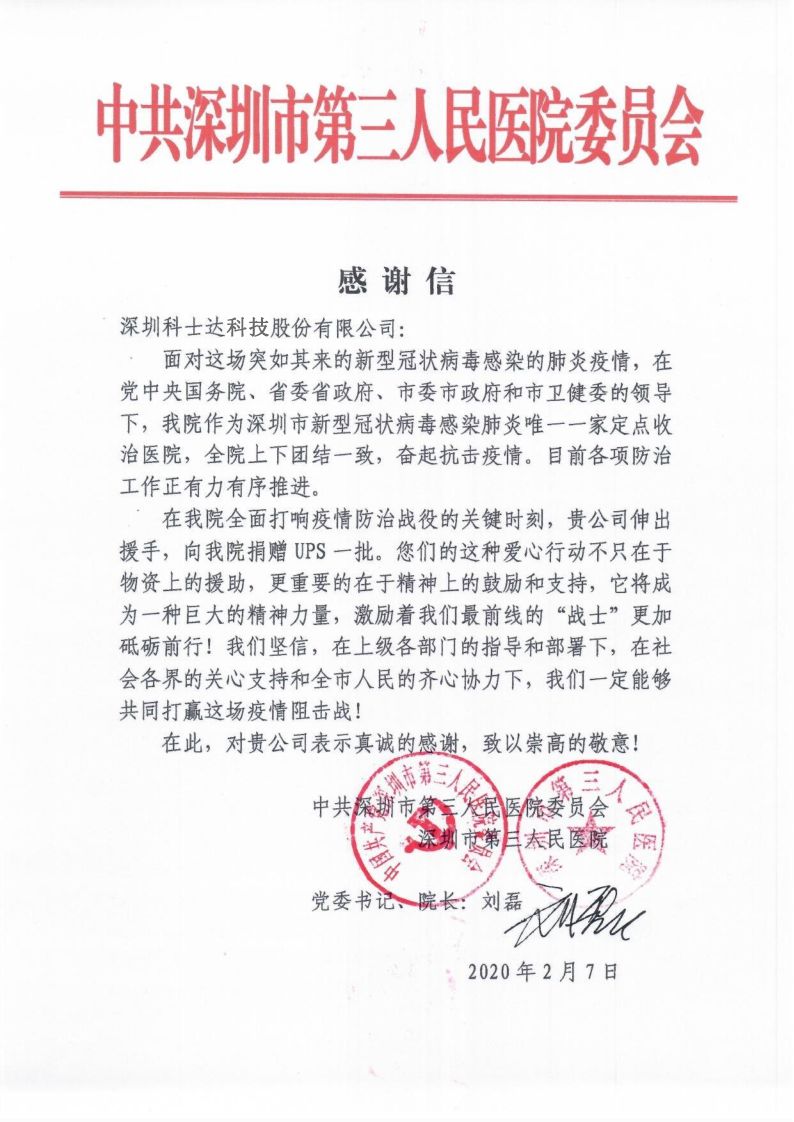 作為一家成長(zhǎng)于深圳的企業(yè),科士達(dá)在助力全國抗疫戰(zhàn)斗,協(xié)助采購緊缺物資的同時(shí),也密切關(guān)注著深圳的疫情變化,一直與深圳市各抗疫相關(guān)部門保持著緊密聯(lián)系。了解到三院的情況之后,科士達(dá)緊急調(diào)撥UPS一批,火速馳援三院,盡己所能,全力以赴,為疫情防控貢獻(xiàn)力量。