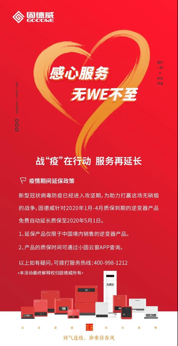 新型冠狀病毒防疫已經(jīng)進入攻堅期,為助力打贏這場無硝煙的戰(zhàn)爭,固德威針對2020年1月-4月質(zhì)保到期的逆變器產(chǎn)品免費自動延長質(zhì)保至2020年5月1日。