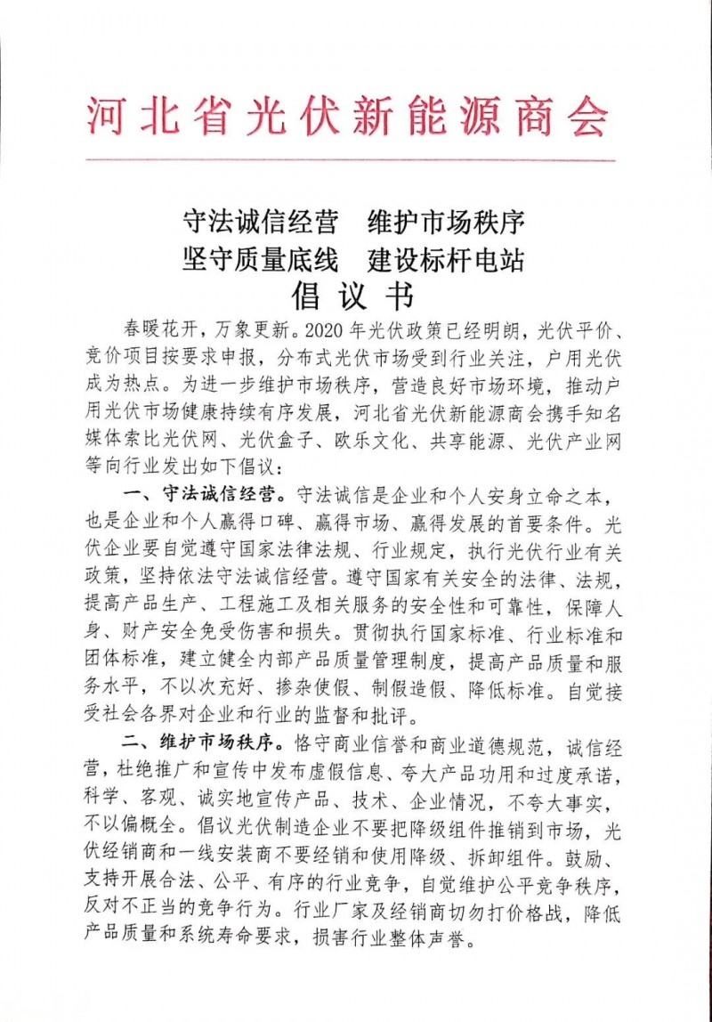 春暖花開(kāi),萬(wàn)象更新。2020年光伏政策已經(jīng)明朗,光伏平價(jià)、競(jìng)價(jià)項(xiàng)目按要求申報(bào),分布式光伏市場(chǎng)受到行業(yè)關(guān)注,戶(hù)用光伏成為熱點(diǎn)。為進(jìn)一步維護(hù)市場(chǎng)秩序,營(yíng)造良好市場(chǎng)環(huán)境,推動(dòng)戶(hù)用光伏市場(chǎng)健康持續(xù)有序發(fā)展,河北省光伏新能源商會(huì)攜手知名媒體索比光伏網(wǎng)、光伏盒子、歐樂(lè)文化、共享能源、光伏產(chǎn)業(yè)網(wǎng)等向行業(yè)發(fā)出如下倡議:
