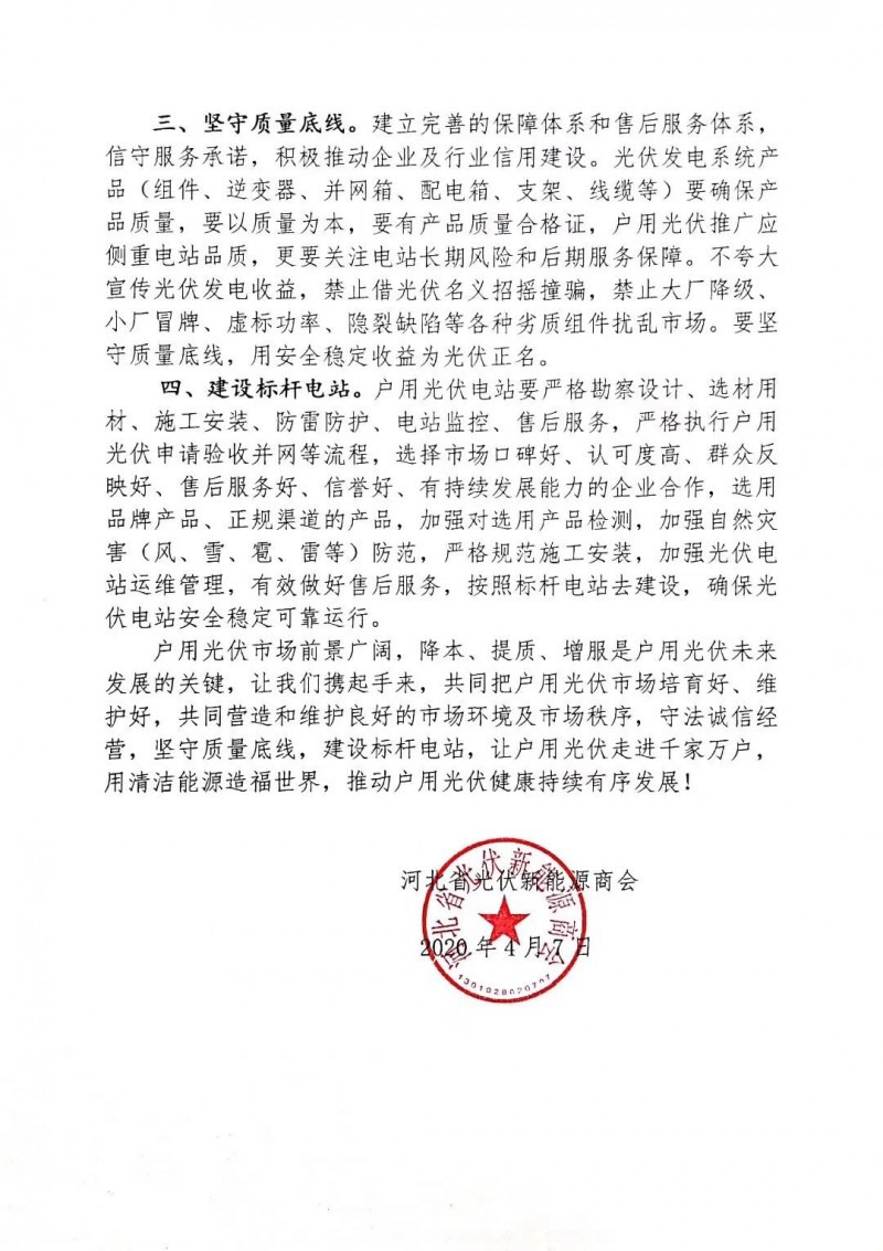 三、堅(jiān)守質(zhì)量底線。建立完善的保障體系和售后服務(wù)體系,信守服務(wù)承諾,積極推動(dòng)企業(yè)及行業(yè)信用建設(shè)。光伏發(fā)電系統(tǒng)產(chǎn)品(組件、逆變器、并網(wǎng)箱、配電箱、支架、線纜等)要確保產(chǎn)品質(zhì)量,要以質(zhì)量為本,要有產(chǎn)品質(zhì)量合格證,戶(hù)用光伏推廣應(yīng)側(cè)重電站品質(zhì),更要關(guān)注電站長(zhǎng)期風(fēng)險(xiǎn)和后期服務(wù)保障。不夸大宣傳光伏發(fā)電收益,禁止借光伏名義招搖撞騙,禁止大廠降級(jí)、小廠冒牌、虛標(biāo)功率、隱裂缺陷等各種劣質(zhì)組件擾亂市場(chǎng)。要堅(jiān)守質(zhì)量底線,用安全穩(wěn)定收益為光伏正名。