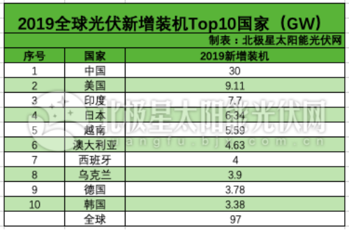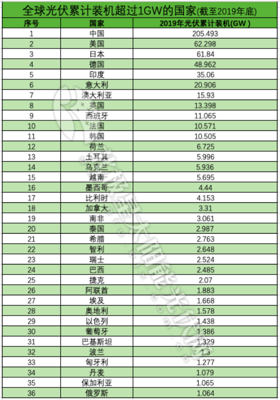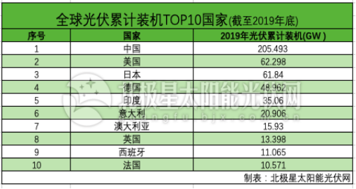 2019全球光伏“成績單”:新增TOP10國家、累計TOP10國家、GW級國家