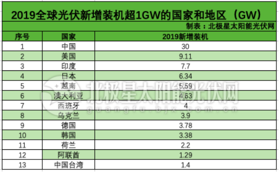 2019年新增裝機超過1GW的國家和地區(qū)達13個: