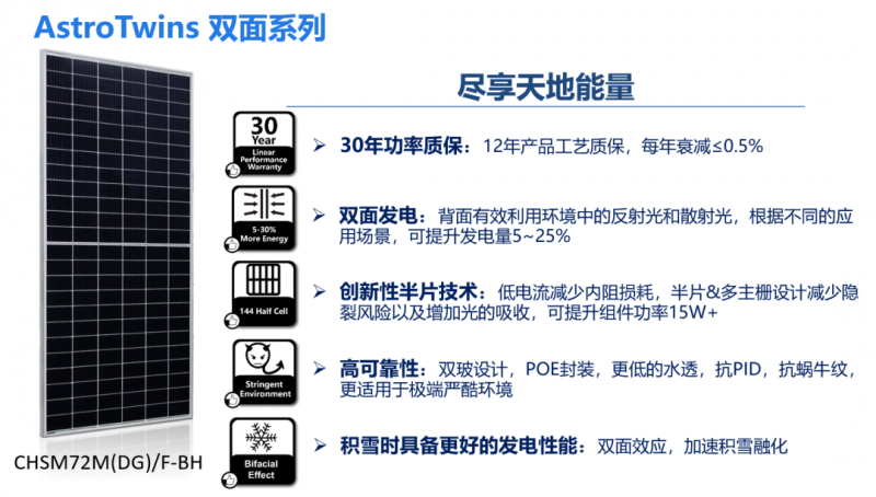 正泰AstroTwins 雙面系列組件具有高發(fā)電量、高可靠性、低度電成本三大亮點(diǎn),充分展示了正泰ASTRO 4 For系列締造持久高效綠色能量的產(chǎn)品理念。產(chǎn)品采用P型雙面發(fā)電技術(shù),與現(xiàn)有PERC產(chǎn)線(xiàn)兼容度高,適合大規(guī)模量產(chǎn),將是未來(lái)提效、降本的趨勢(shì)。根據(jù)各種地面條件下雙面組件發(fā)電增益的試驗(yàn)結(jié)果表明,AstroTwins雙面組件根據(jù)應(yīng)用環(huán)境不同能增加發(fā)電量達(dá)5%~30%。同時(shí)疊加大尺寸硅片、半片、MBB等高效技術(shù),最高功率可達(dá)450W。