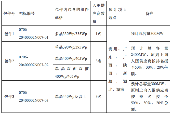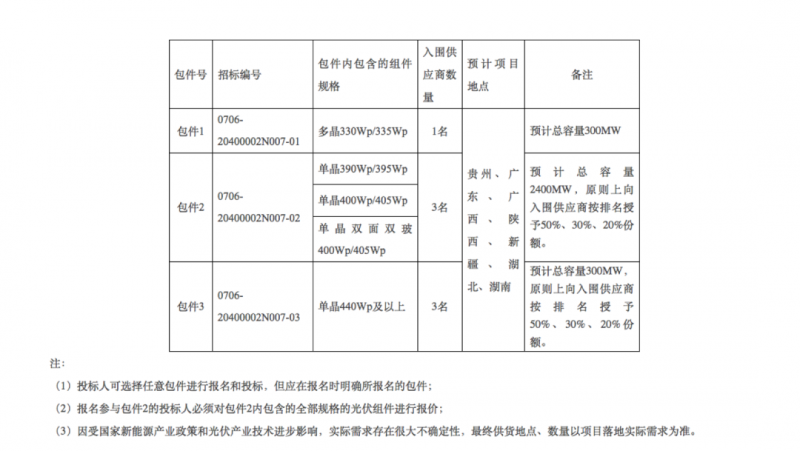 本次招標(biāo)組件主要用于貴州、廣東、廣西、陜西、新疆、湖北、湖南項(xiàng)目,報(bào)名參與包件2的投標(biāo)人必須對(duì)包件2內(nèi)包含的全部規(guī)格的光伏組件進(jìn)行報(bào)價(jià),不接受聯(lián)合體投標(biāo),最終供貨需求以項(xiàng)目實(shí)際落地容量為準(zhǔn),5月9日開標(biāo)。