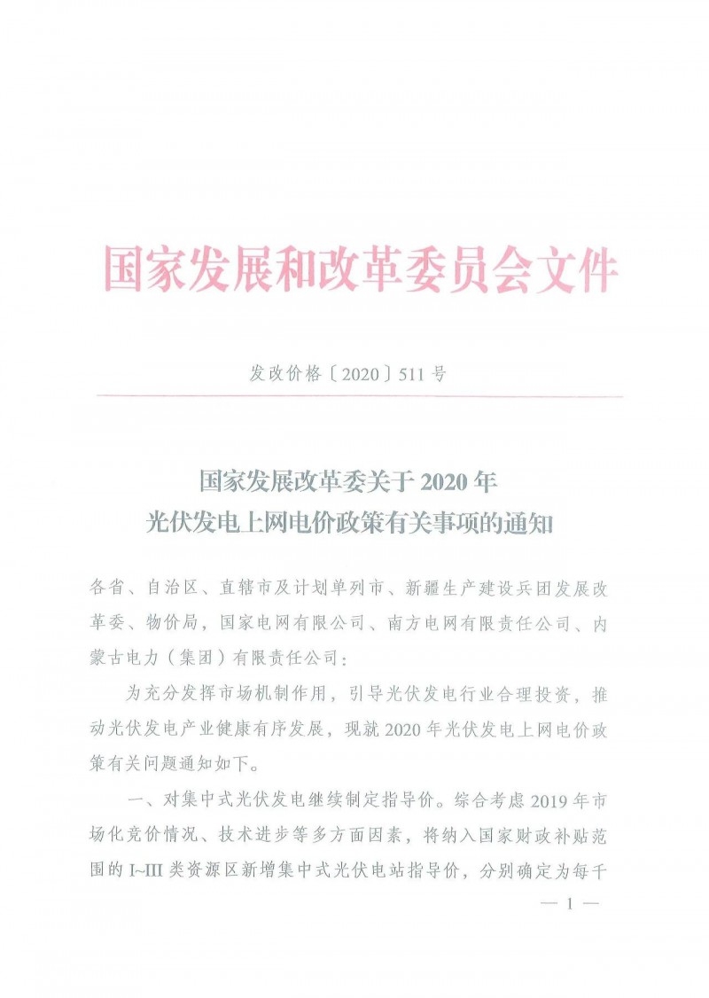 2020年3月31日,國家發(fā)改委價格司發(fā)布 發(fā)改價格〔2020〕511號《國家發(fā)展改革委關(guān)于2020年