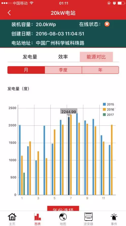 可以選擇歷史數(shù)據(jù)中的月、季度、年數(shù)據(jù)進行對比分析,客觀反映電站所在地區(qū)光照強度變化及電站衰減情況。