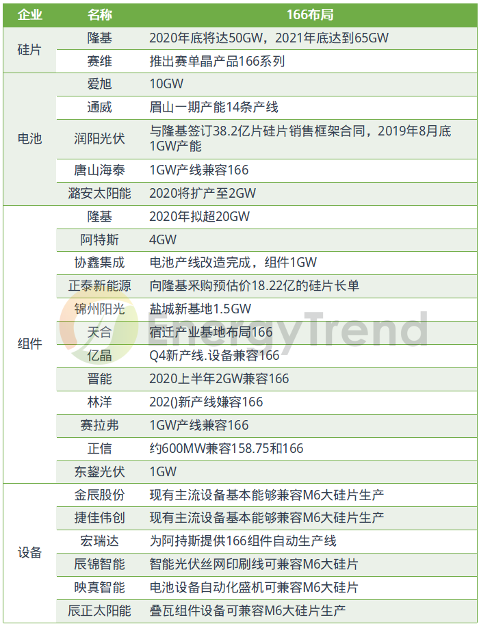2019年7月,愛(ài)旭第一批166mm大尺寸電池正式下線,計(jì)劃到2020年底,公司將擁有10GW的166高效電池產(chǎn)能。愛(ài)旭認(rèn)為,到2020年M6的出貨量將占其產(chǎn)量的60%以上,到2021年將增至90%。
