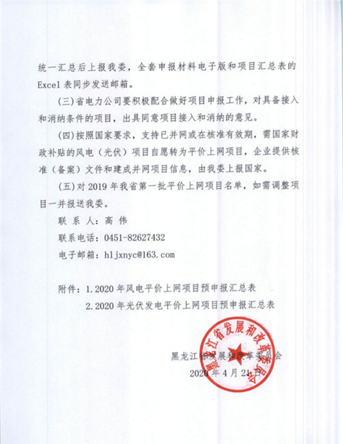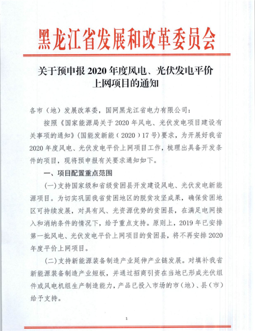 4月21日,黑龍江發(fā)改委印發(fā)《關(guān)于預(yù)申報2020年度風電、光伏發(fā)電平價上網(wǎng)項目的通知》,就2020年風、光平價項目申報的有關(guān)注意事項指出相關(guān)要求。