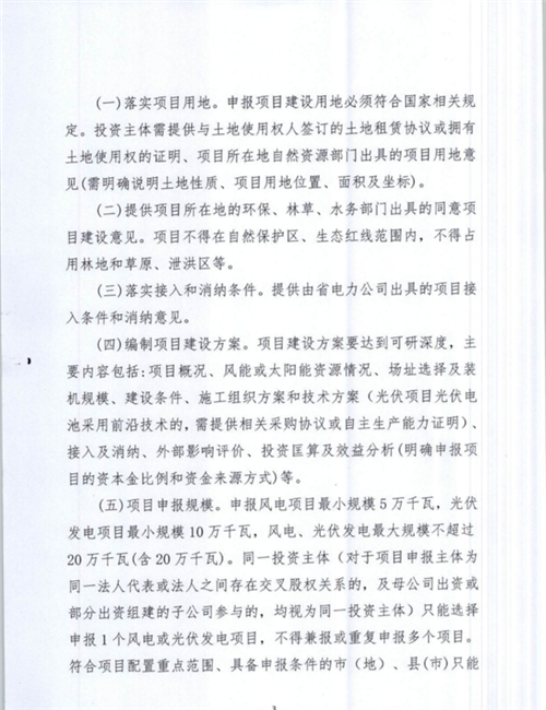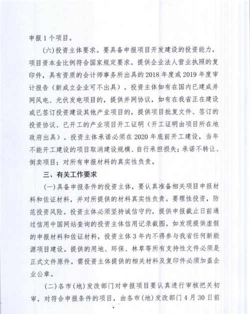 通知要求,風電項目最低申報規(guī)模不得低于50MW,光伏不得低于100MW,最大規(guī)模不得超過200MW。同一投資主體只能申報1個風電場或光伏項目,投資主體須在2020年底前開工,支持存量項目轉(zhuǎn)平價,報送截止日期為4月30日。