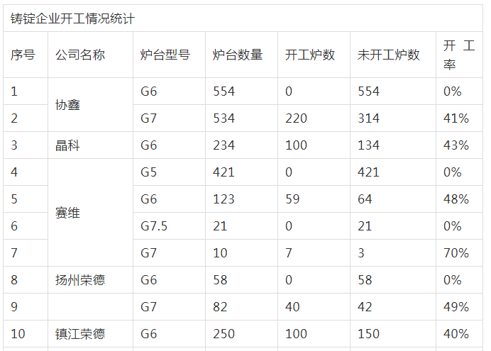 受單晶硅片價格大跌倒逼,在現(xiàn)金成本紅線徘徊的多晶硅片價格也跟著下跌,目前多晶硅片市場價格在1元/片左右,已經(jīng)跌破多晶硅片的現(xiàn)金成本,目前多晶硅片的現(xiàn)金成本在1.2元/片左右(非硅成本0.6元/片,硅料成本0.6元/片),這也意味著目前還在生產(chǎn)的多晶硅片企業(yè)正在虧著現(xiàn)金,因此不少多晶硅片企業(yè)不得不暫時停產(chǎn)或減少開工鑄錠爐臺數(shù),那么目前市場哪些鑄錠企業(yè)停產(chǎn)了呢?哪些鑄錠企業(yè)還在生產(chǎn)?還在生產(chǎn)的鑄錠企業(yè)開爐情況如何?光伏新聞特意做了一個調(diào)查,光伏新聞不完全統(tǒng)計的結果為:目前全行業(yè)鑄錠爐臺數(shù)量為5266臺,開工爐臺數(shù)量為1454臺,鑄錠爐平均開工率為28%。具體各鑄錠企業(yè)開工情況如下表所示: