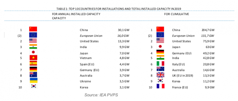 歐盟的裝機容量接近16GW,歐洲其他國家大約增加了5GW。2019年歐洲市場新增裝機最大的是西班牙(4.4GW),其次是德國(3.9GW)、烏克蘭(3.5GW)、荷蘭(2.4GW)和 法國(0.9GW)。