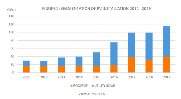 就光伏電站類型而言,數據顯示,與2018年相比,分布式光伏市場的絕對數量略有增長。不過,與集中光伏電站相比,這一比例相對下降。2019年,由于許多國家招標計劃的大力推動,大型地面電站的絕對數量有所增長。