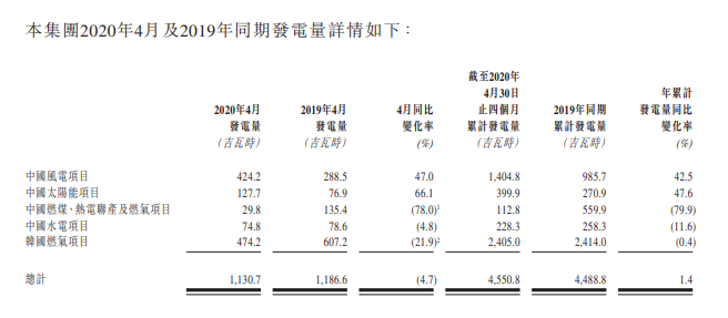 截至2020年4月30日止四個月,本集團累計完成發(fā)電量4550.8吉瓦時,比2019年同期增加1.4%。其中,中國風電項目增加42.5%,中國太陽能項目增加47.6%,中國燃煤、熱電聯(lián)產(chǎn)及燃氣項目減少79.9%,中國水電項目減少11.6%及韓國燃氣項目減少0.4%。