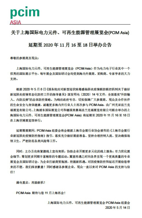 廣州光亞法蘭克福展覽有限公司副總經(jīng)理梁志超先生就延期決定表示:“我們過去幾個月一直努力不懈,務求使展會能如期在7月舉辦。但是我們必須考慮到來自全球各地的展商及研討會嘉賓的健康狀況, 以及行業(yè)是否有充足時間進行復蘇等因素, 因此我們與業(yè)內(nèi)涉眾協(xié)商后決定將展會延期至11月舉辦。在年底辦展的風險相對較低,除了能提高更多海外專家參與的機會,也讓我們有更多時間準備舉辦一場全面的國際盛會。再者,2020年的PCIM Europe將以線上方式在7月7至8日舉行,我們認為有必要在今年內(nèi)為業(yè)界提供直接見面交流的機會,這一點對協(xié)助行業(yè)復蘇至關重要。”