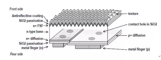 在高壽命的N型硅片襯底的背面形成相間的P+和N+擴散區(qū),前表面制備金字塔狀絨面來增強光的吸收,同時在前表面形成前表面場(FSF)。前表面多采用SiNx的疊層鈍化減反膜,背面采用SiO2、AlOx、SiNx等鈍化層或疊層。最后在背面選擇性地形成P和N的金屬接觸。